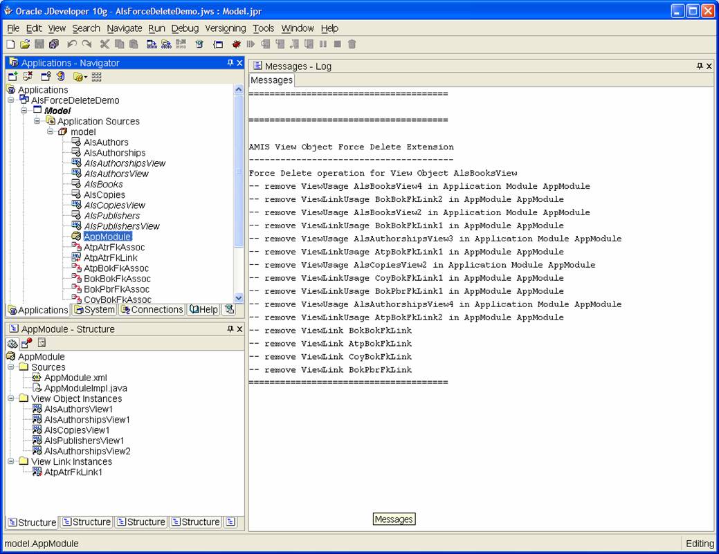 This post is the sequel to AMIS publishes a ViewObject Copy tool – JDeveloper 10g Extension (plugin) for ADF Business Components that we released last week. That post announced a ViewObject Copy extension for JDeveloper, this one discusses a tool that does almost the reverse (and more): it can Force Delete a ViewObject with all its dependencies.