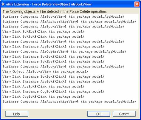 Before the force delete is performed, the tool will show you a list of all objects – ViewObject, ViewLinks, ViewObject Usages and ViewLink Usages (the latter two within the Application Modules’ Models). This overview looks something like this: .