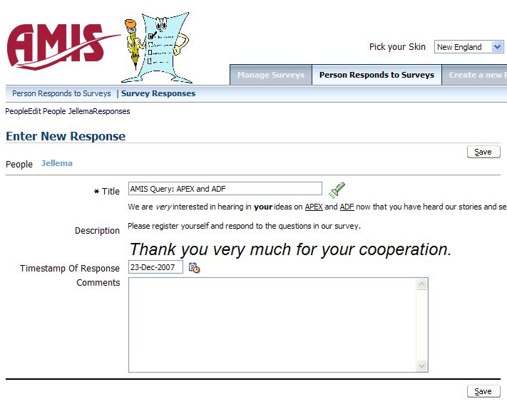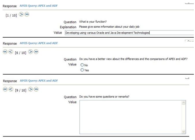 Like most AJAX functionality in ADF applications, this has been achieved with a few simple, declarative settings. The table with Answer Options is contained within a PanelHeader element. This element has its rendered attribute set to an expression that evaluates the value of the QuestionStyle; if the style is equal to ‘mc’, then the panelHeader is rendered – and the answer options are visible. The partialTriggers attribute of the parent element of the panelHeader is set to SurveyQuestionsStyle; that means that whenever a Partial Page Render request cycle is processed, the panelGroup is up for re-evaluation (and dynamic update) and its children may be rendered is before they were not or vice versa.