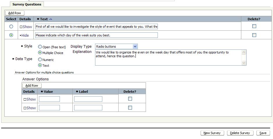 When we define a new or edit an existing Question in a Survey, it depends on the style of the question whether or not the Answer Options are shown. Only for Question with style equal to Multiple Choice are these answer options shown: