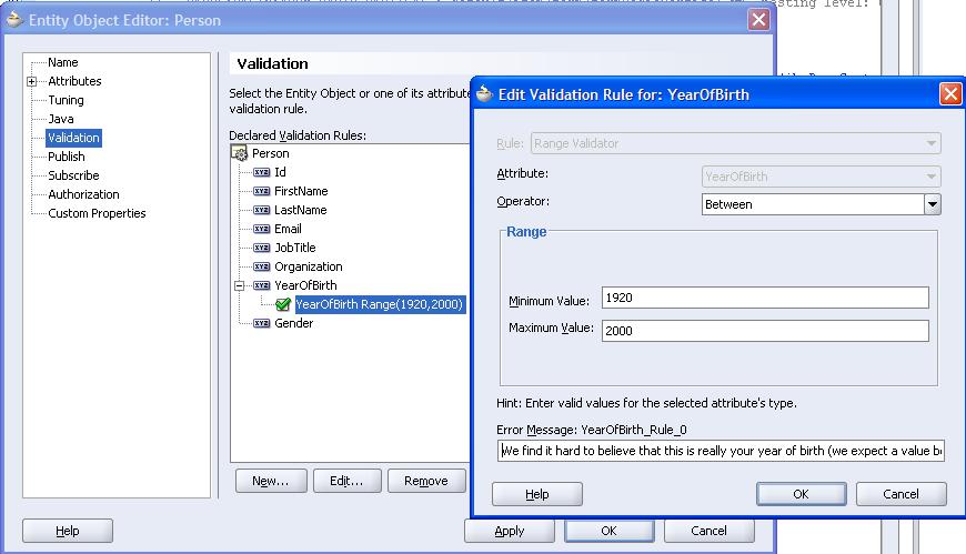 The validation on the Year of Birth value was not added to the View layer but included in the Model. In the Entity Object for Person, I have created a validation rule: