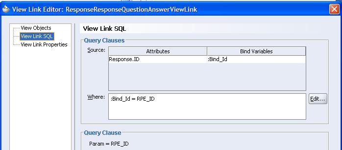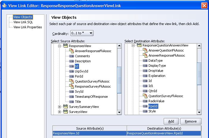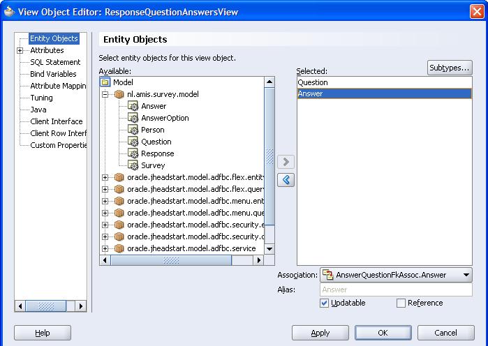The ViewObjects used for the Summary of all Surveys as well as the Question/Answers summary within one survey are both read only ViewObjects with free format queries. The two views are connected via a ViewLink; this makes for easy navigation & synchronization in the Summary page.