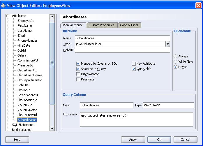 that returns the cursor expression as a SYS_REFCURSOR. The Expression for my VO Attribute Subordinates now becomes: get_subordinates(employee_id ).