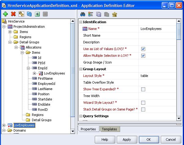 2. The template is associated to the ProjectAllocations group by setting the template property in the JHeadstart Application Editor: