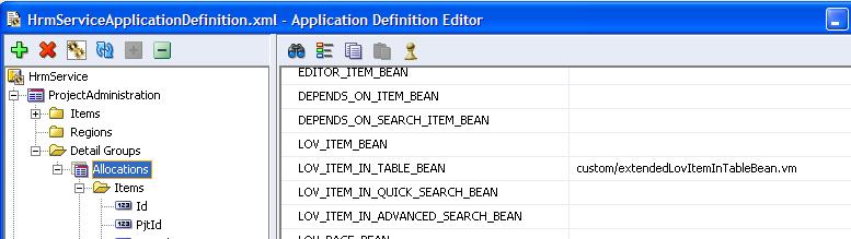 1. The New Custom Template is called extendedLovItemInTableBean.vm and created in the directory ViewController\templates\custom. It has to modifications compared to the default version: it referenced the ExtendedLovItemBean class rather than the ‘plain’ LovItemBean and it has a new managed property nestedRecordAttributeMapping that specifies how values in the cursor records are mapped to the new ProjectAllocation records.