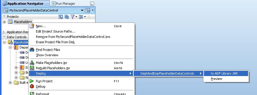 Just like I have created the ADF Library for the Placeholder Data Control, I will create one for the HrmService ADF BC Application Module on top of the DEPT and EMP tables in the Scott schema.