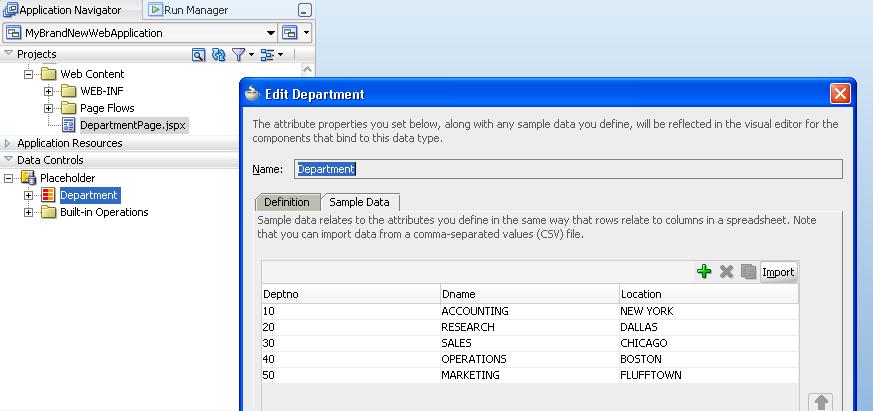 Like I said before, we did not copy any stuff from the Jar file to the consuming project – all we did was add a reference to the library. If we now make a change to the Placeholder Data Control, for example add a new Department in the Department Data Type’s Sample data, we can redeploy the project to the ADF Library and that change should be visible in all projects that consume the Library.
