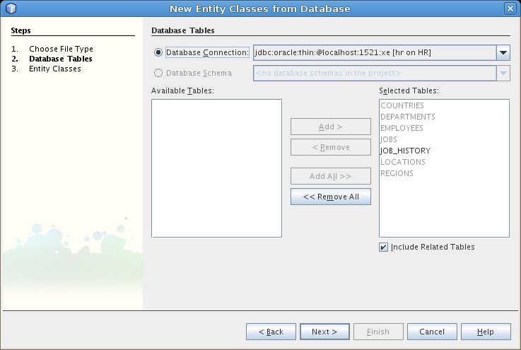 If you haven’t created a database connection in Netbeans yet, this would be a good time to do it. If you don’t Netbeans will prompt you for it later. However, for most databases you need to register your JDBC driver first and you won’t be able to do it when Netbeans prompts you for a database connection. After having created the database connection, right click the MavenEnterpriseApplication-ejb project and select New -> Entity Classes From Database. In the wizard that pops up, select your database connection and then select the tables you want to create Entities for. Since I am using Oracle XE I have created a database connection to the HR schema. Therefore I selected all tables in the HR schema.