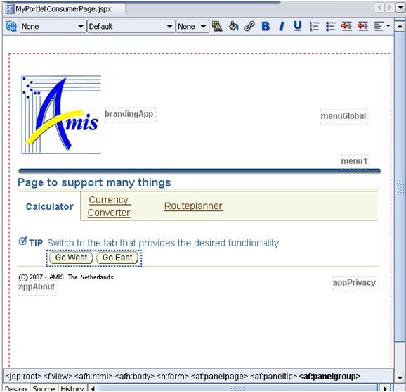 Oracle WebCenter allows JSF (including ADF Faces) applications to consume Portlets. That means that our own application can pretend to be a portal too. Anywhere in the JSF page, we can embed a Portlet and even integrate that Portlet with our page – exchanging data, synchronizing views. The WebCenter Framework takes care of merging together the rendered content from the JSF page and the embedded Portlets as well as the synchronization of the page and its Portlets.