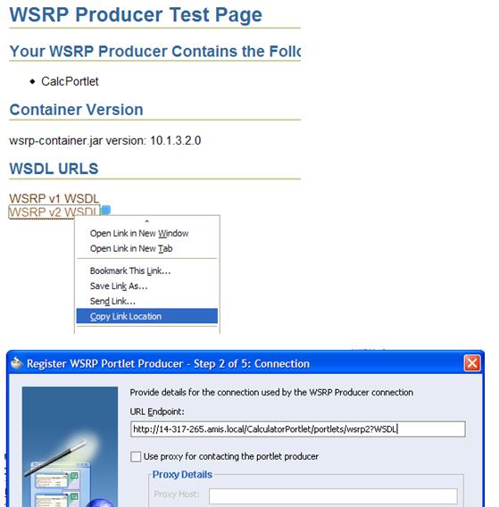 In order to be able to register the WSRP Producer with an JSF Application, there has to be one of course. That means that the Portlets we want to consume have to be deployed to a WSRP Portlet Container. For most 3rd party portlets, we have to do little extra work over just deploying the EAR fie to a JSR-168 Portal Container. See also WebCenter Developer’s Guide 18.9.3 Deploying a Third Party JPS-compliant Portlet to OC4J (http://download-east.oracle.com/docs/cd/B32110_01/webcenter.1013/b31074/jpsdg_java_intro.htm#BHCCBABA ).