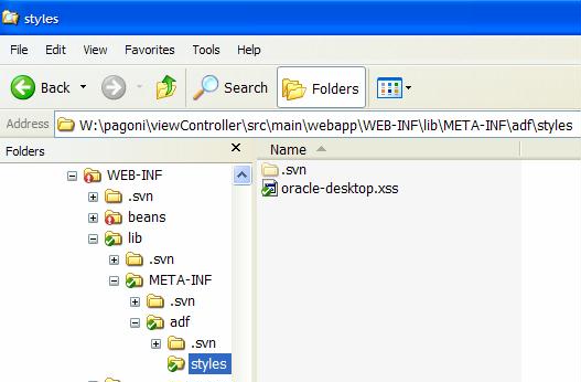 The first step to customizing the Oracle skin is extracting oracle-desktop.xss from the jar-file. Save this file in a directory called WEB-INF\lib\META-INF\adf\styles, like this: