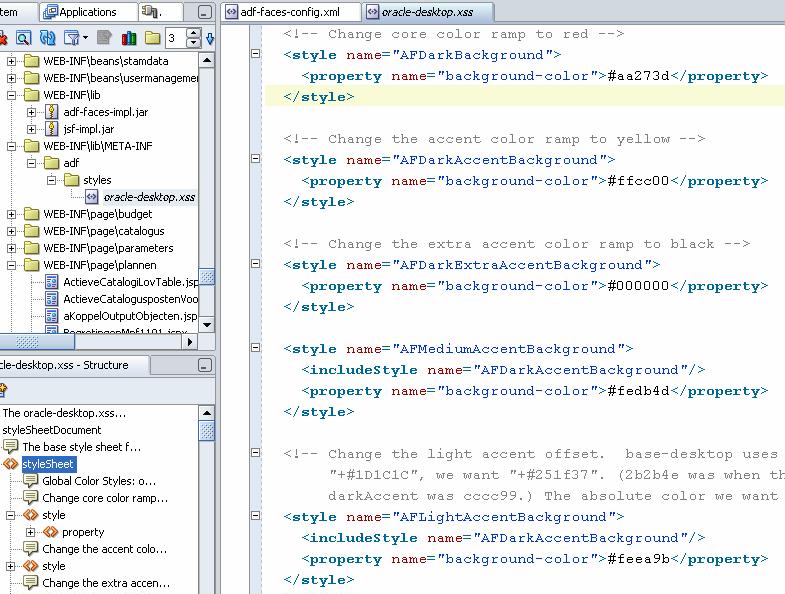 Now when you run your ADF Faces application, it will use this file to dynamically generate a CSS, at runtime. In this file, we can specify colors and fonts, thereby influencing the Oracle BLAF. Here is a fragment from the oracle-desktop.xss that we customized in order to give our application an AMIS look and feel: