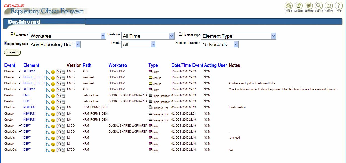 This Dashboard is developed by the same developer as the rest of the Repository Object Browser. However, it improves on the search facility – that actually turns out to be flawed in certain instances. The code makes use of various Oracle 9i features – whereas the ROB is mainly Oracle 7 with just a pinch of Oracle 8 and 8i specific stuff. Note that the trigger is not mandatory to install: it allows you to search for changes in objects, even if those changes were made in a secondary access element, for example an attribute in an entity or a column in a table. If you do not install the trigger, the Dashboard will work fine but when you change a secondary element like a column or attribute, the primary element will not be seen as changed!