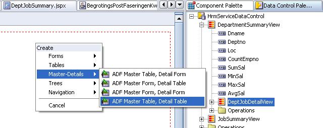 It’s Departments and Employees again: we want to show a summary for each Department; this summary contains for example the number of employees and the total salary sum. Furthermore, for each department we also want to list some detail data: we want to see all Jobs in the department and for each job the number of staff as well as the total salary sum. After creating a new ADF application, I create two View Objects – one for the DepartmentSummary and one for the DepartmentDetailsPerJob. They are connected through a (master-detail) ViewLink. Next I create a new JSF page.