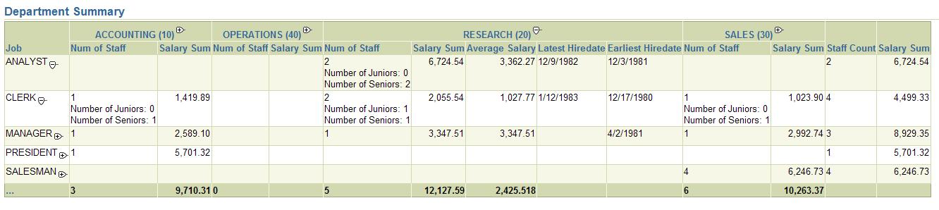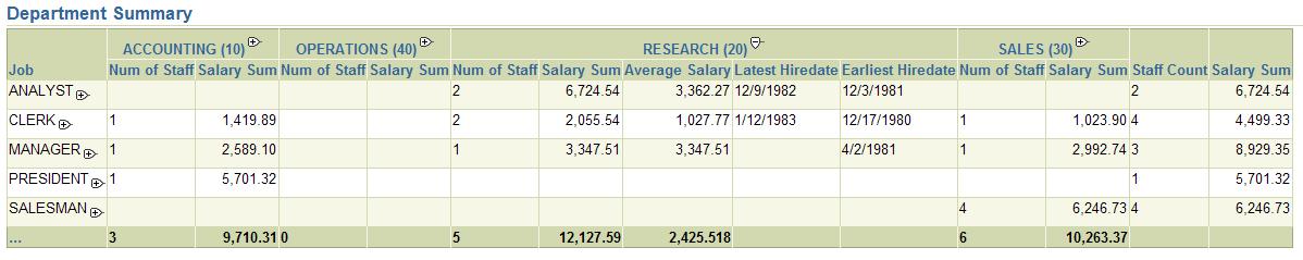 We have more details to display, both for master 1 the Departments as well as for master 2, the Jobs. For Departments for example we have the Average Salary per job as well as the Minimum and Maximum Hiredate per job (indications of the job experience in the department). Those are details that are interesting at times. However, by blindly adding them to the matrix, it becomes cluttered. Now we can benefit from the detail disclosure feature of our matrix; this allows us to specify cells that are in a detail disclosure. This means that they are only shown when the user explicitly expands the column detail disclosure. It looks like: