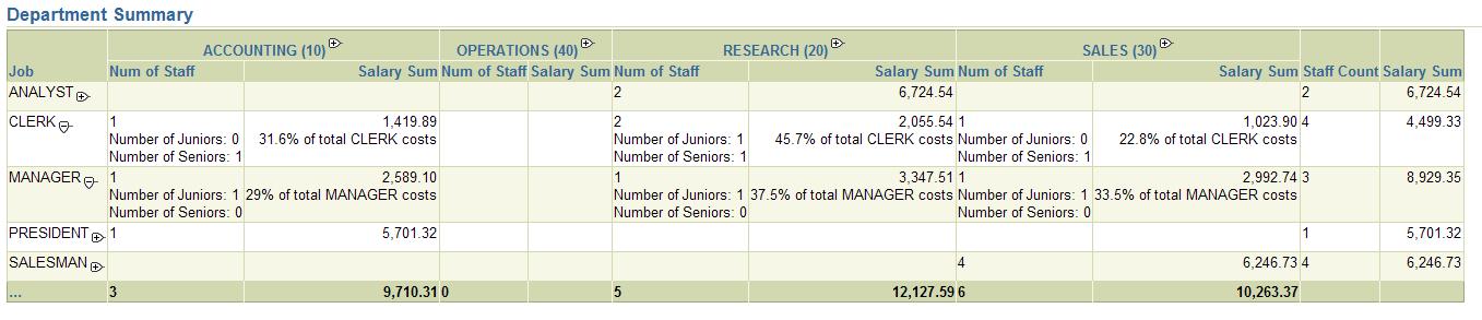 Let’s make it a little clearer with an example: we can add a cell that displays the percentage earned of the overall Salary Sum for a certain Job by the Employees in that Job in the Cell’s Department. Something like: the Clerks in Department 10 cost 24% of the overall Clerk costs. In the matrix, that looks like: