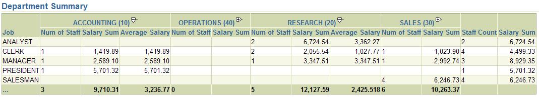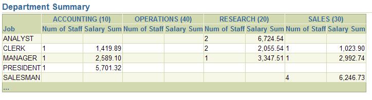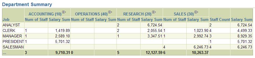 Right now, the matrix displays only the number of employees in a specific job for each department. That is a good first step, but we would like to also see the the Salary Sum for every department, preferably in a neat column of its own. Something like: