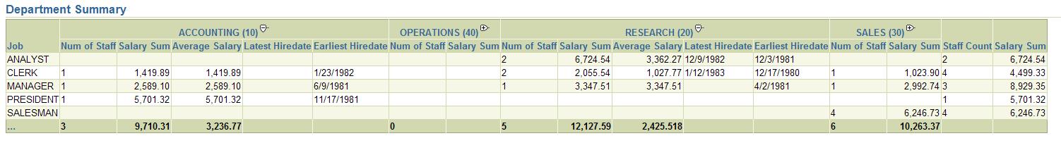 The most remarkable about these additional columns is the fact that the Latest Hiredate is only displayed when the department has more than one employee in the job – if there is just one employee, the earliest and latest hiredate would be the same; displaying them both is only additional clutter. To add these two detail columns, we need: