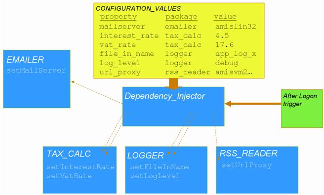 The crux now becomes the mechanism to inject those values. The injector could be implemented in several ways. For example a central package that is invoked from an on-logon trigger (so once for every PL/SQL session). This package needs to know which packages it should inject with values and which values to inject for which properties. The values to inject can be held in a database table, in PL/SQL code or even be read from a file or a web service. Note that the values can be user- or application specific. For this example, let’s assume there is a table called CONFIGURATION_VALUES with columns package, property and value.