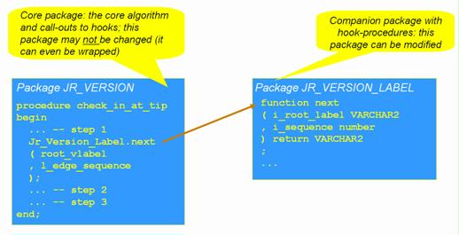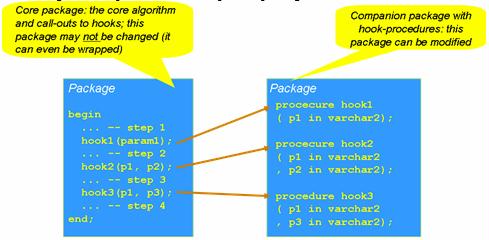 The Core Package should not be touched, it may even be wrapped. Users of the reusable component will invoke the core package, but should not look at its body. The core package will make calls to the helper procedures or hooks in the companion package. These procedures may be implemented/modified.