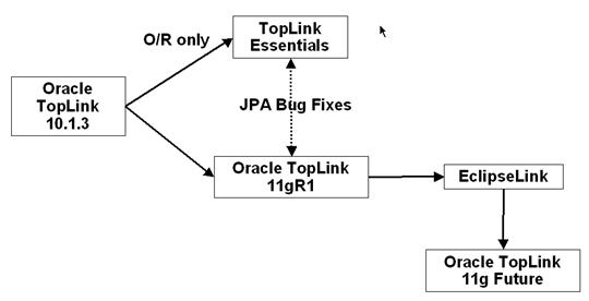 The Roadmap in terms of versions and editions is outlined below. The figure illustrates how TopLink Essentials is on a separate branch from the full TopLink 11g and EclipseLink products – with mutual bug fix synchronization. Note: TopLink Essentials will not be extended with the full EclipseLink functionality, it will just be the JPA reference implementation – upgraded for JPA 2.0 when that spec will be set.