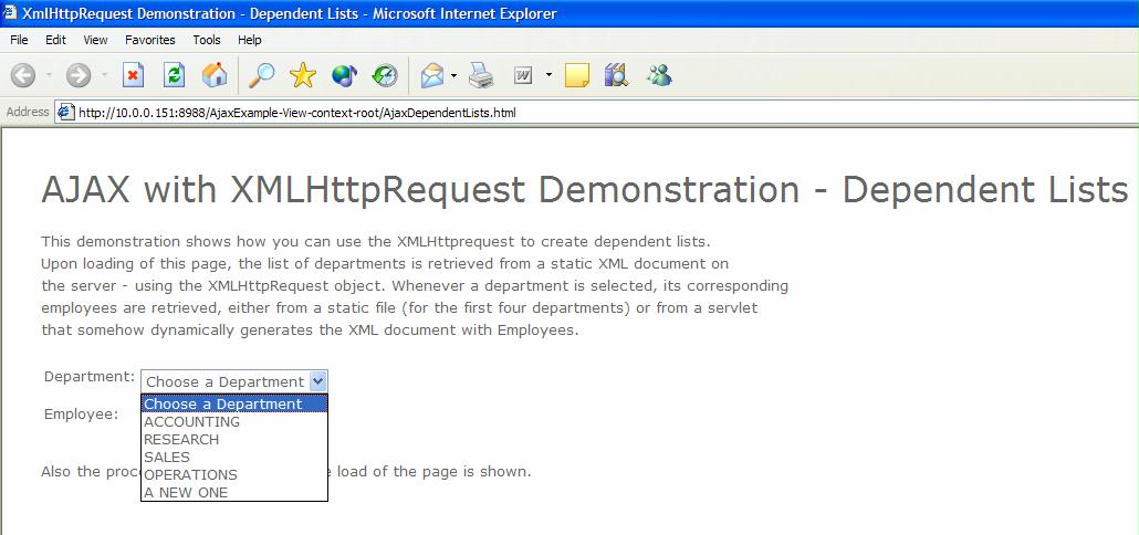 Here is the browser shown after the page was loaded and the list of Departments was populated using XML.