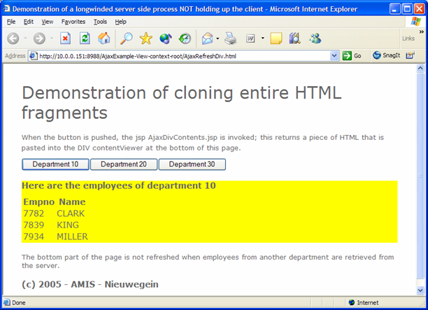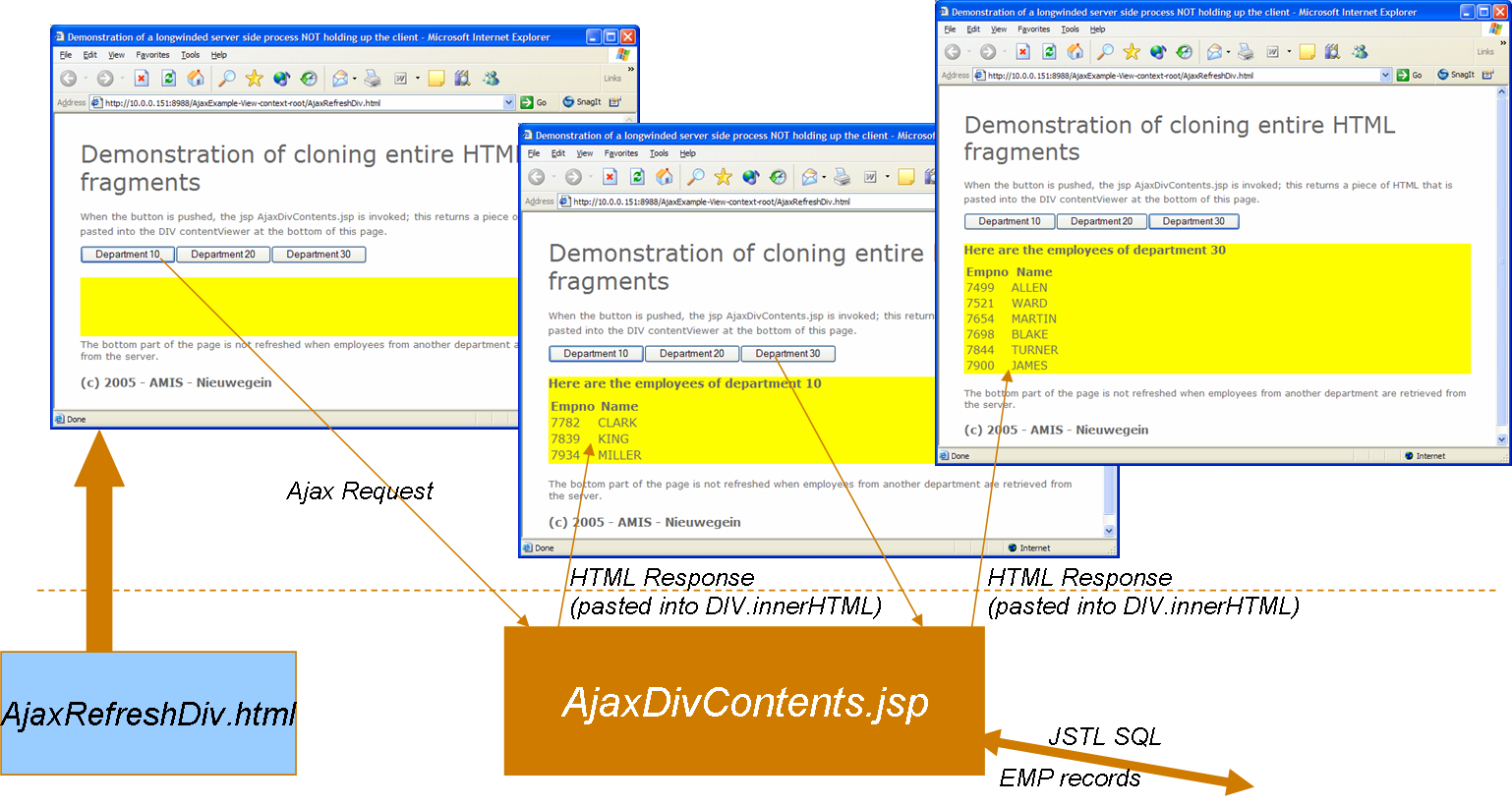 Of course when buttons are pressed for other departments, the process is repeated with a different deptno value. Note that the HTML page is loaded once, with the buttons, the JavaScript and the DIV contentViewer element. When a button is pressed, the server is asked – asynchronously – to return a bit of HTML. That HTML is put inside the DIV – while the rest of page is not changed! Only the DIV contents is refreshed.The entire process is illustrated in the next picture: