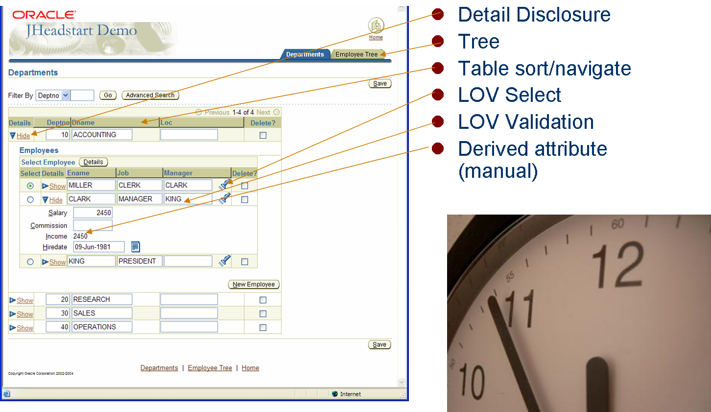 - detail disclosure; this is represented through the Hide/Show links: any record in the multi-record layout can be ‘disclosed’. When that happens, through Partial Page Refresh additional fields for this record are retrieved from the server and displayed, just like is done for Employee CLARK and Department ACCOUNTING in the picture below