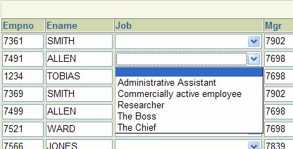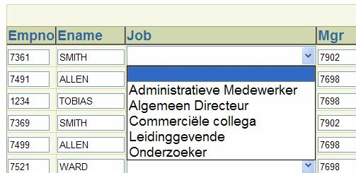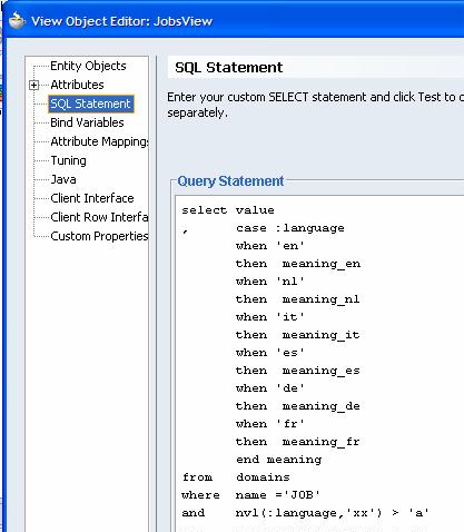 When we create a simple straightforward ADF Faces application with a SelectOneChoice compont based on this JobsView, the content of the dropdownlist adapts to the language set in the browser running the web application. We do not need any additional configuration for this, as the ADF mechanics ensure that the browser locale is made available to the ADF BC Session object and we have just made sure with our generic ViewObjectImpl that any occurrence of the language bind parameter that still has the meaningless default value set has the current locale’s language set.