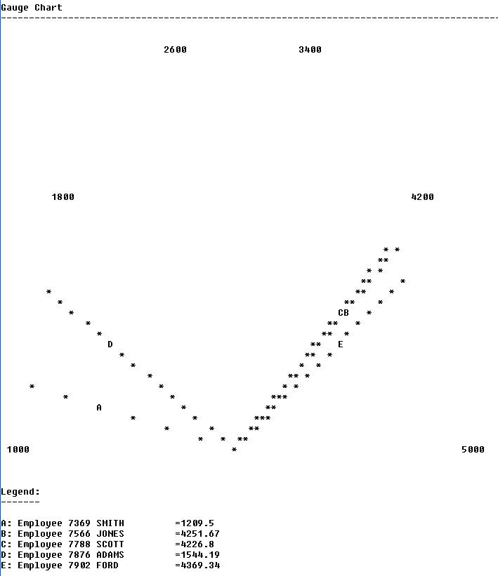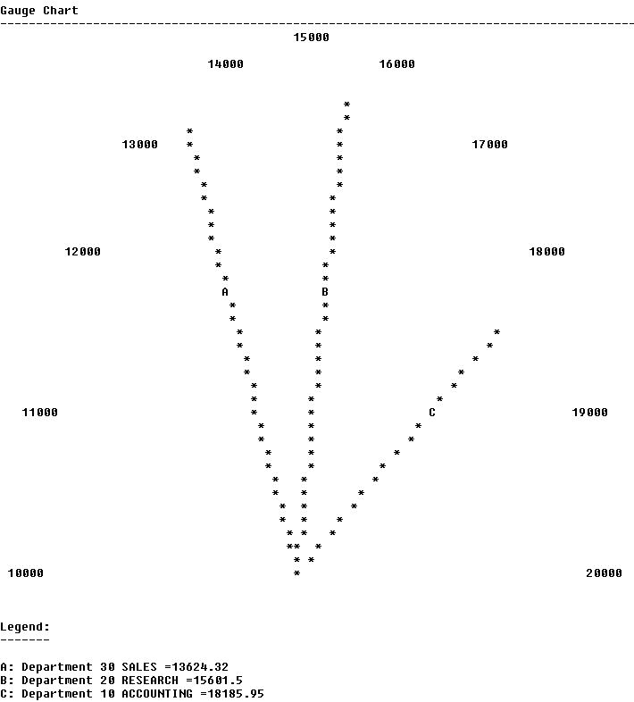 I may be at JavaOne 2007, the important work still has to go on. Hence the latest in a series of SQL powered charts and graphs: the Gauge or Speedometer. Using nifty graphical tricks and the SQL*Plus 3D Pack, I managed to create a query that can render visually compelling, not very interactive charts, such as the one below, showing the Salary Sum for the three departments in the EMP table: