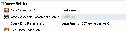 • In the Table Groups, we usually need to define a bind parameter: the View Object underlying the Table Groups – like ClerksInDepartment or SubordinatesUnderEmployee – will typically have a bind-parameter – like department or manager – that we need to supply a value for. In the Group definition for the Table Groups, go to the Query Bind Parameters property and specify the expression for this bind-parameter. For example: department=#{TreeHelper.key} or manager=#{TreeHelper.key}. The key property in the TreeHelper bean will contain the NodeKey for the selected node; this should be the Deptno for the department under which we have selected the Clerks node or the Empno of the Employee under which we have selected the Subordinates node.