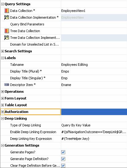• In the Form Groups, we need to enable Deep Linking. Switch to Expert mode in the Application Definition Editor by clicking on the little Pawn Icon. If you do not see a pawn and you do see a crown – in the upper right hand corner of the property palette – then you are in Expert Mode. Go to the Deep Linking section in the property palette. Choose Query by Key Value as Type of Deep Linking. Set the Deep Linking Key Expression to #{TreeHelper.key}. This ensures that if we navigate to the Edit (Form) page generated for this Group, it will query the underlying ViewObject using the value in TreeHelper.getKey() as primary key. Thus we can go edit the currently selected Department or Employee if TreeHelper.getKey() returns the deptno or empno of the selected Department or Employee.