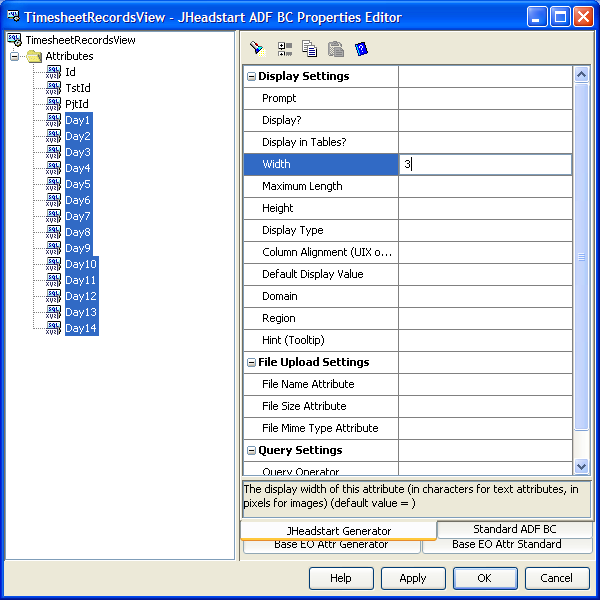 - edit the Timesheet Records ViewObject: set the display width for all day1..day31 attributes to 3; set display to false for Id and TstId;set the prompt for pjtId to project and set the prompts for day1..day31 to 1..31