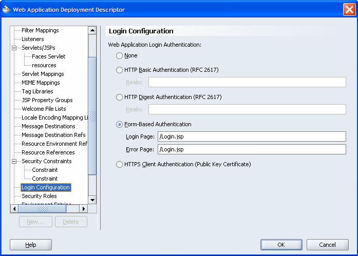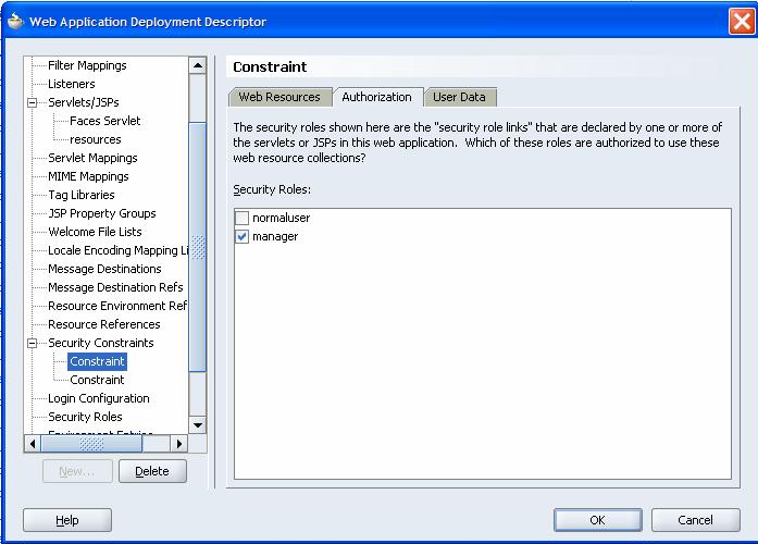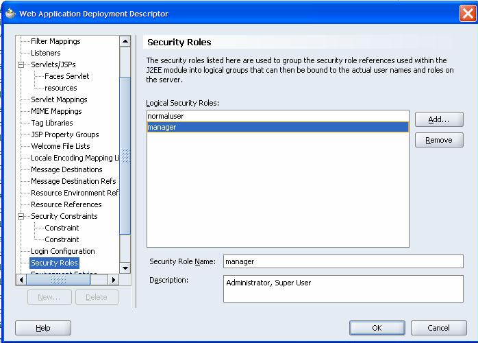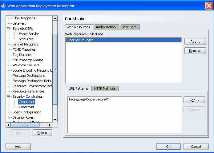 JDeveloper provides a wizard style interface for creating all these entries in the web.xml file. Open the right mouse button menu on web.xml, select the option Properties and the editor pops up. Editing Security Constraints looks like this: