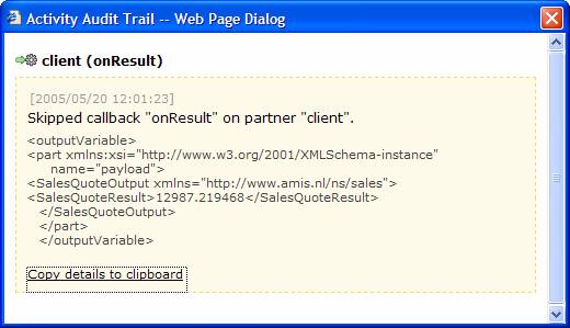 After we have posted the request, we have to wait for a little while before we can find the results of executing this process instance. The Audit tab provides all details of the process: how long each step took, what data was fed into each step and what the results of executing each intermediate process step were. Note: in the Debug Tab we can find a detailed overview of process execution associated with the WebService’s WSDL-file. The Flow shows a visual representation of the process instance. Note: this is a sub-set of the Process Design we have created in Oracle BPEL Process Manager. Only those process steps and sequence that were actually executed in this instance are shown.