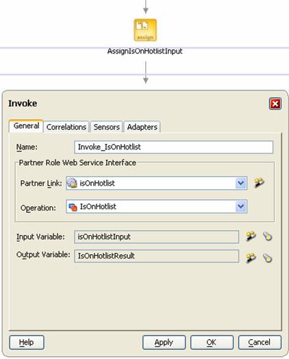 Here we invoke the IsOnHotlist partnerlink. I have had Oracle BPEL Designer auto-create the input and output variables for all invocations. In Assignments just before and just after the invocation, I prepare the input-variables or retrieve values from the output-variables.