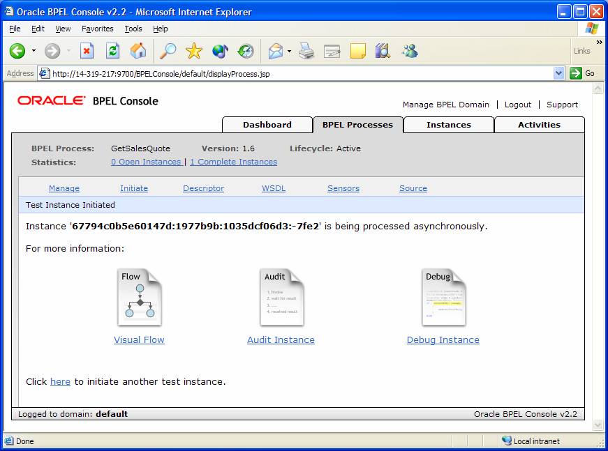 I select the GetSalesQuote process and navigate to the Initiate tab-page. Here I can start execution of a BPEL Process Instance.
