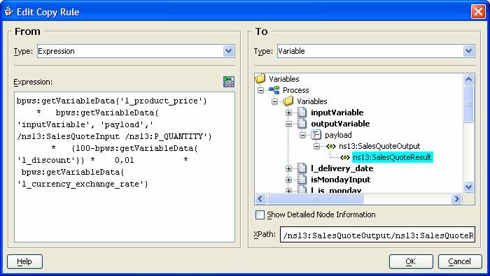 Oracle BPEL Designer contains an expression editor that is invoked from the Copy Rule Editor that is started from the Assignment Activity Editor.