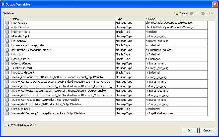 In addition to the (indirect) redefinition of the inputVariable and outputVariable, I have created a number of global variables to carry values through the entire BPEL process. Note that these variables correspond with the local variables in my original PL/SQL code; I have even given them the same names to make this projection obvious. Another set of variables is implicitly (or automatically) created variables for the input and output associated with invocations of the Partner Links. The complete list of variables looks as follows: