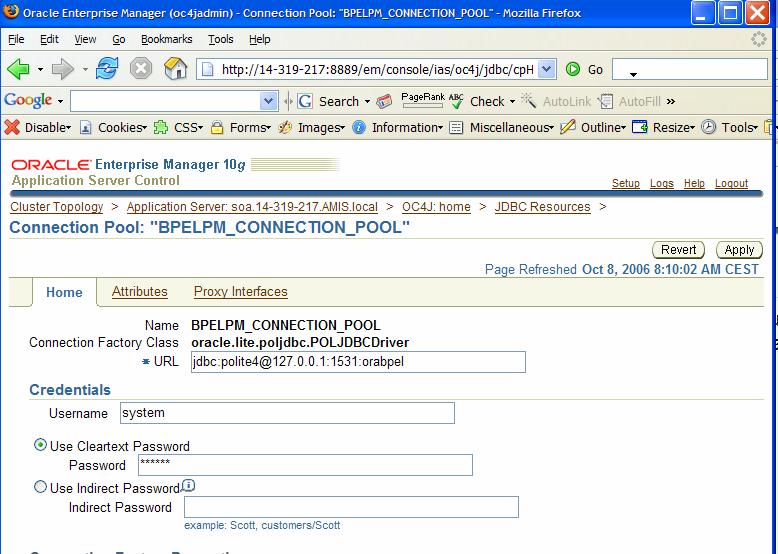 It does not tell me the password, but the entire URL is here as well as the username I am looking for. I might guess that the password used is manager, but how can I find out for sure? Well, since I am looking at an entirely local installation, I have easy access to the OC4J directories. In the directory SOASUITE_HOME\j2ee\home\config I find the file data-sources.xml. In this file is the entry corresponding with the definition of the Connection Pool shown in the screenshot: