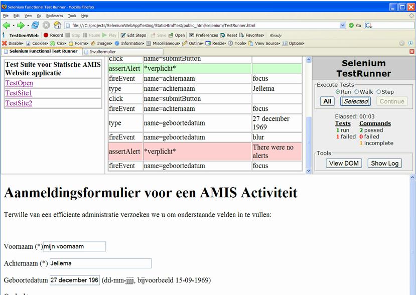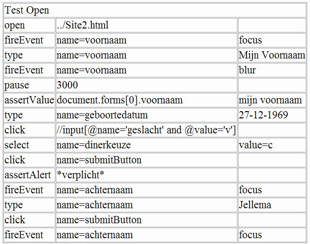 - At this moment, we do not test whether the application enforces the format dd-mm-jjjj format on the Geboortedatum field. Let us add test commands to set the Geboortedatum to an erroneous value, blur the field and test for an alert. Add the following table records in the table in TestSite2.html: