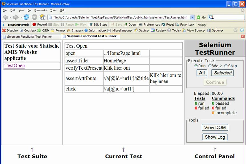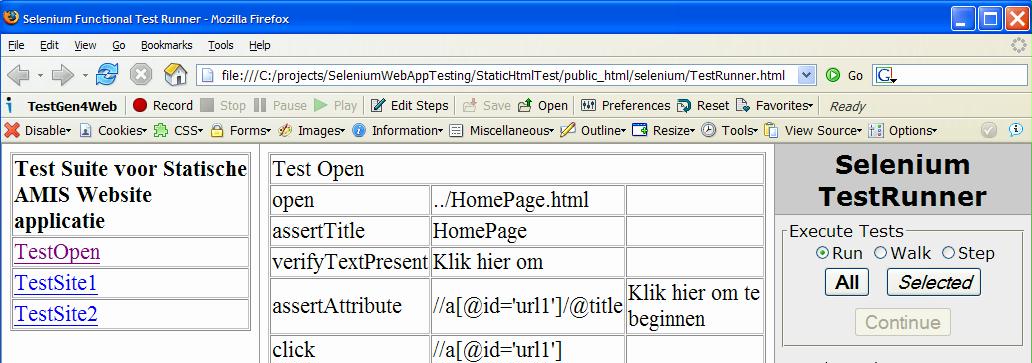 - Time to run our first Selenium TestSuite. Open the file selenium\TestRunner.html. This in turn will open TestSuite.html and TestOpen.html.