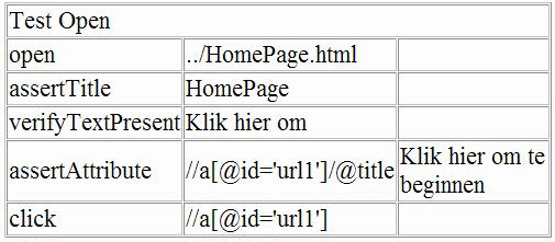 - Check if the title attribute of the anchor element with id equal to url1 has a value of “Klik hier om te beginnen” (assertAttribute)
