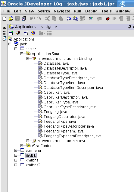 Tests are performed using JDeveloper 9.0.5 (build 1618) as IDE with JVM 1.4.2_05 (Sun) on SuSE 9.1 Linux. During the test I found out that JDeveloper 9.0.4 (shipped with Oracle Developer Suite 10g) with JVM 1.4.2_03 on WindowsXP gave errors (NullPointerException) while starting the JVM. I tested the ease of generating source code from an XML Schema Definition file (Figure 2 or 3 for testing support of namespaces) and I tested the ease of invoking the generated classes/interfaces into own code, that is, reading (query) an XML document (Figure 1); appending new gebruikers and databases to the XML document and writing the result to an XML file. Use of namespaces in de schema definition file is conveniant because it will allow the same element names as Java classes to be used. For instance element