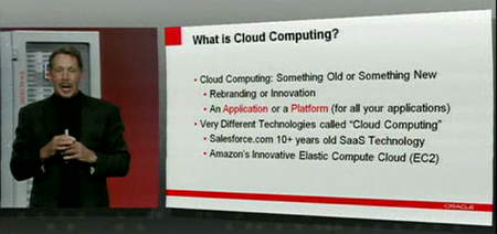 Oracle’s definition of Cloud Computing is the same as Amazon’s. Cloud computing is about a platform, on which to run a wide variety of applications and tools. It must be virtualized and elastic, including both hardware and software.