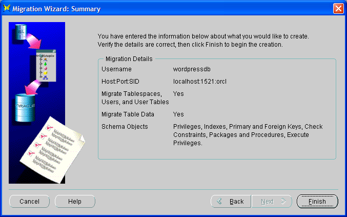 This wizard will take the details of the Source Model as well as the Oracle (target) Model set up by now in the OMWB Repository and run the actual migration. The wizard presents a summary of what it will do: