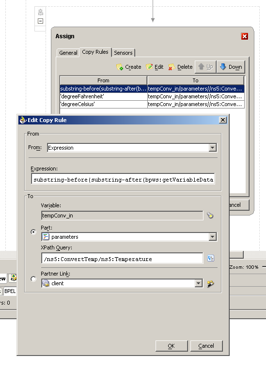 In our example, we’re getting the temperature for an airport from the first service, and call another service to convert the temperature from degrees Fahrenheit to Celsius. Nothing fancy but it’s just a way to call 2 services and pass data from one to the other. The first services returns a string containing the temperature, so we’ll somehow have to extract the numbers of degrees from the string, because the second service requires a number as input. This is achieved by using a copy rule, where we don’t copy directly from a variable but use an expression containing xpath functions to get to the variable data and strip the temperature from it: