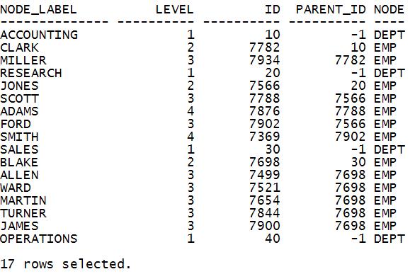 with nodes as ( select deptno id , 'DEPT' node_type , -1 parent_id , dname node_label from dept union all select empno id , 'EMP' node_type , deptno parent_id , ename node_label from emp where job ='MANAGER' union all select empno id , 'EMP' node_type , mgr parent_id , ename node_label from emp where job <>'MANAGER' ) select node_label , level , id , parent_id , node_type from nodes connect by prior id = parent_id start with parent_id =-1