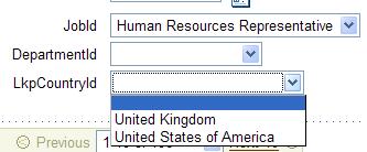 The LkpCountryId, JobId and DepartmentId should be displayed in the Advanced Search form as dropdownlists. We set the appropriate display type for these items and select the domain to derive the values from.