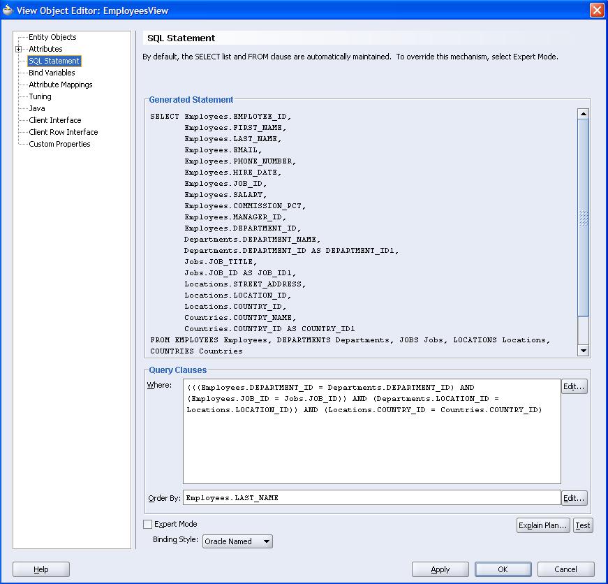 The EmployeesView is composed from the Employee Employee Entity joined to several lookups: JOBS, DEPARTMENTS, LOCATIONS and COUNTRIES. This will make it possible to search for employees on criteria like Job Title, Department Name and Country Name.